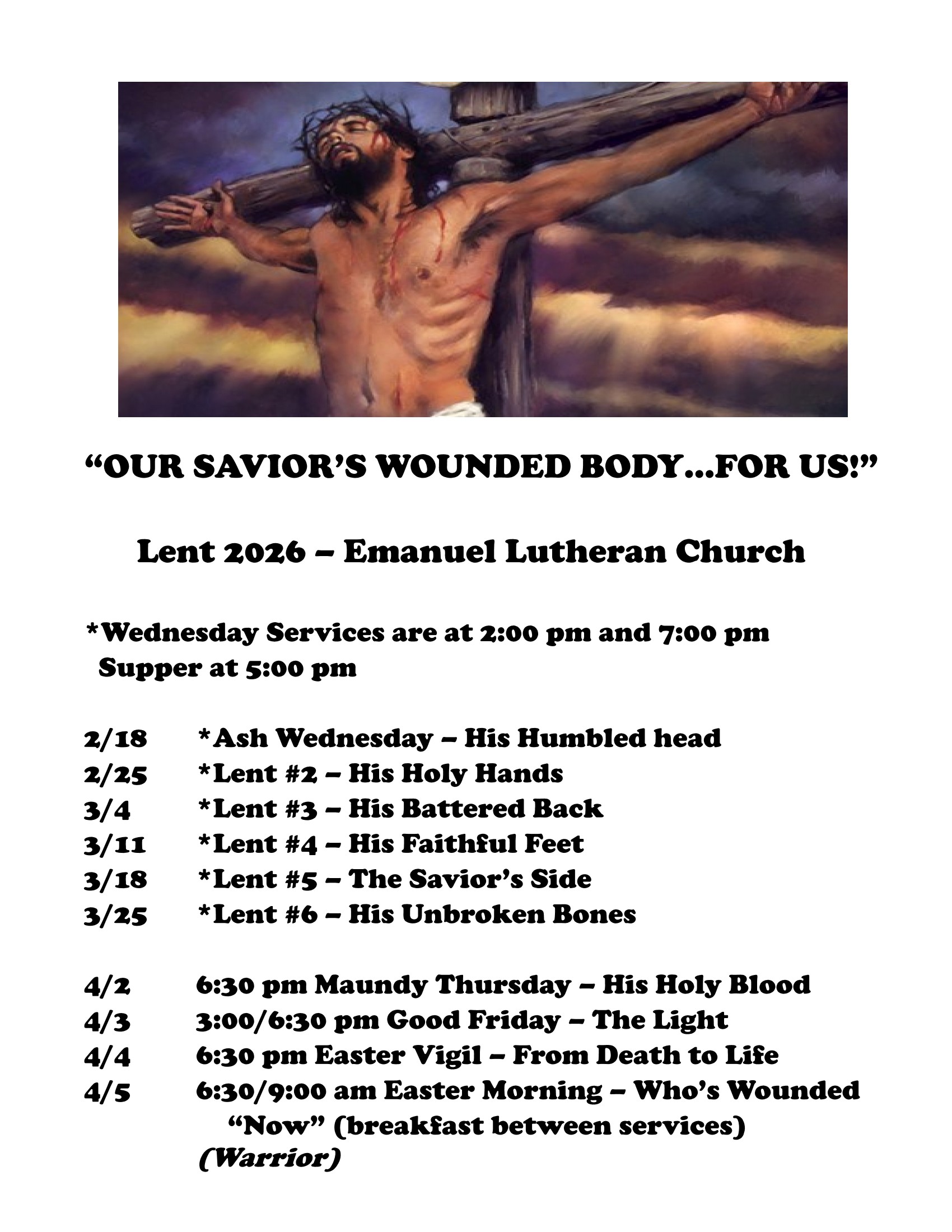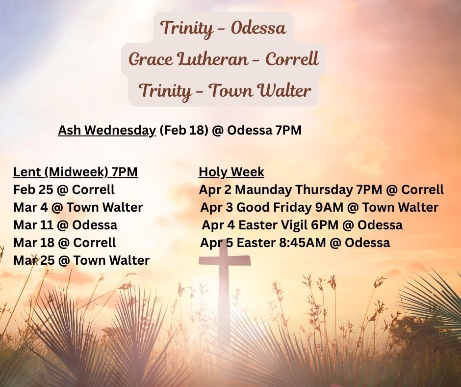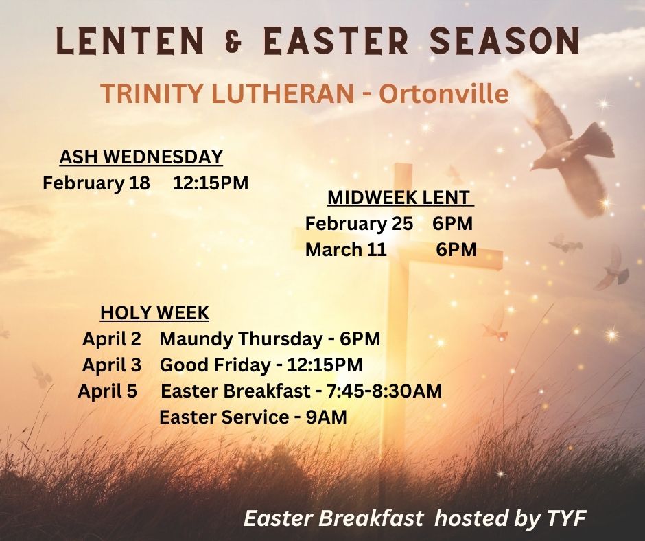 Lenten and Easter Season (click on photos below to ENLARGE) TRINITY – Ortonville Odessa, Correll, Town Walter Emanuel – Milbank Share this: Share on X (Opens in new window) X Share on Facebook (Opens in new window) Facebook Like Loading...